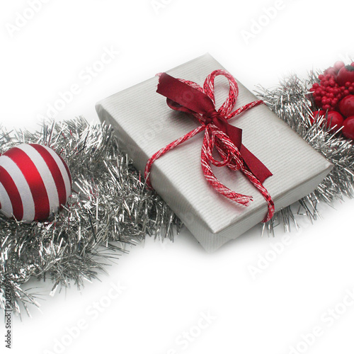 pacco regalo di Natale argento e rosso isolato su sfondo bianco con decorazioni - Buy this stock photo and explore similar images at Adobe Stock | Adobe Stock